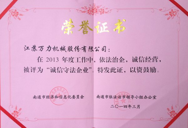 2014年3月20日,公司被南通市經(jīng)濟和信息化委員會、南通市依法治市領(lǐng)導(dǎo)小組辦公室聯(lián)合表彰為“2013年度誠信守法企業(yè)”。