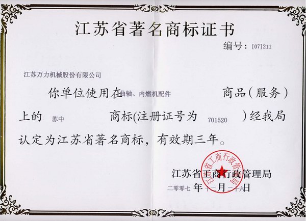 2007江蘇省著名商標(biāo)證書